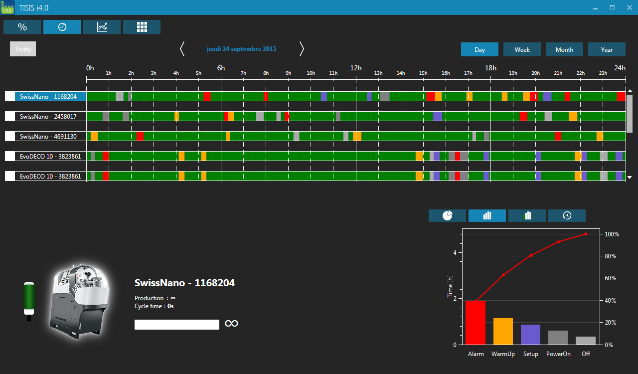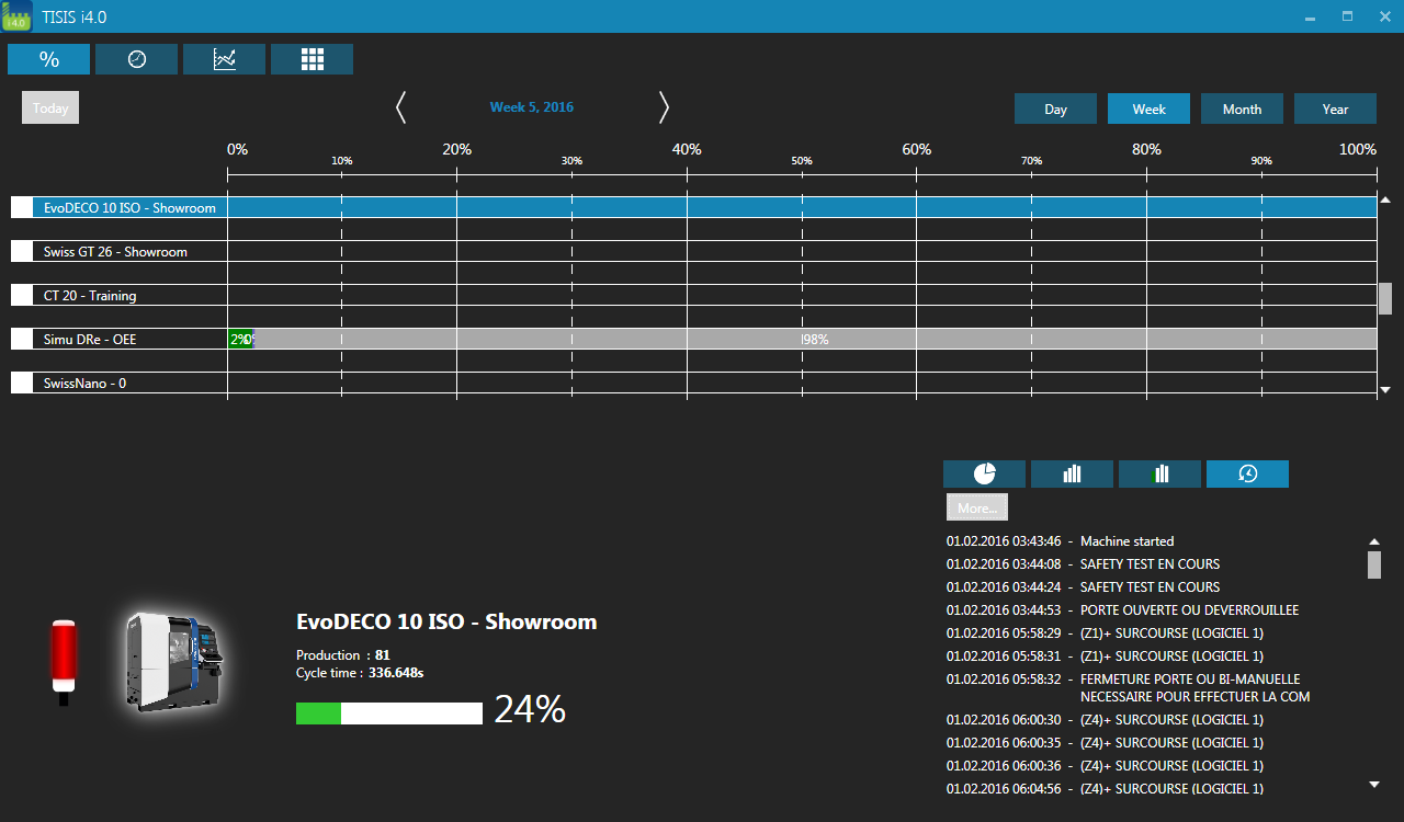 Für die Verwaltung der Gesamtanlageneffektivität (OEE) gibt es viele Angebote auf dem Markt, aber TISIS i4.0 ist eine automatisierte und sofort einsetzbare Lösung. Alle Informationen werden ohne Anwendereingriff automatisch im System erfasst. Die Daten aller Maschinen, einer Maschine oder eines bestimmten Zeitraums können jederzeit im CSV-Format (kommagetrennte Textdatei) exportiert werden.